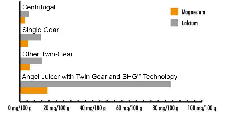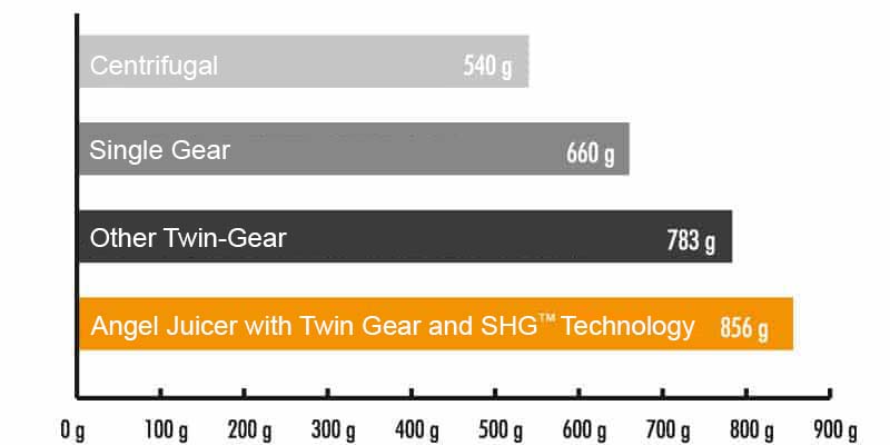 Minimal oxidation and thus particularly nutritious juices with the highest possible proportion of minerals, vitamins, trace elements, enzymes, and secondary plant substances. Almost no heating of the pressed material due to low friction because of the very low number of revolutions. Angel Juicer is one of the twin-gear juicers (twin-gear juicer) with the lowest number of revolutions.